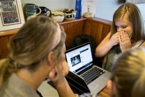 College of Saint Benedict’s Amanda Baloun, of Sartell, wipes her face as she cried watching a press conference on a laptop after a hearing for Danny Heinrich,Tuesday, Sept. 6, 2016 in St. Joseph, Minn. Heinrich confessed Tuesday to abducting and killing 11-year-old Jacob Wetterling nearly 27 years ago, recounting a crime that long haunted the state with details that included Jacob asking right after he was taken: “What did I do wrong?” (Renee Jones Schneider/Star Tribune via AP)